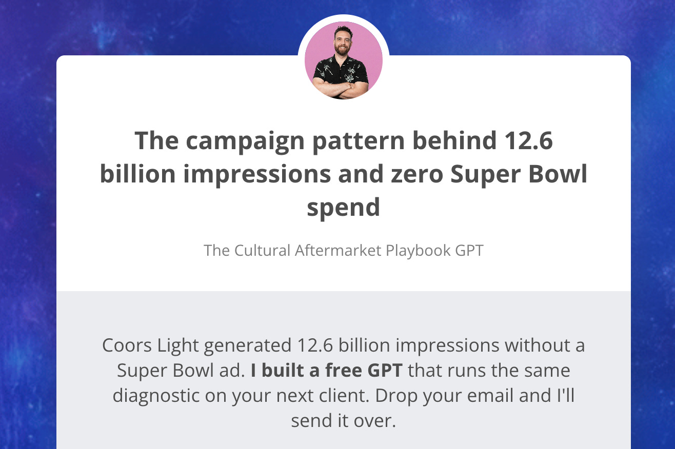 The exact pattern Coors Light used to generate 12.6 billion earned media impressions with $0 in Super Bowl ad spend. Put in your own campaign and see if the pattern applies.